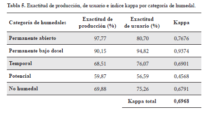 En la Tabla 5 se presentan los valores de exactitud de producción y usuario de cada una de las categorías. Se destacan los valores de 97,77 y 90,15 de exactitud de producción para los humedales permanente abiertos y bajo dosel respectivamente, y de 80,70 % y 94,82 % de exactitud del usuario. La categoría de potencial presenta los valores más bajos de exactitud.