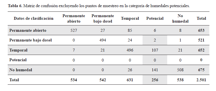 Matriz de confución excluyendo los puntos de muestreo en la categoría de humedales potenciales.