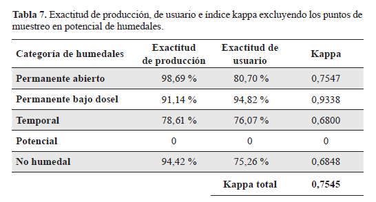 Exactitud de producción, de usuario e índice kappa excluyendo los puntos de muestreo en potencial de humedales.