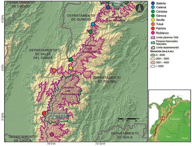 Este estudio abarcó tres complejos de páramo localizados en la cordillera Central de Colombia: Los Nevados, Chilí-Barragán y Las Hermosas. Los muestreos estuvieron limitados a localidades ubicadas principalmente en la vertiente occidental de la cordillera Central (excepto la localidad Rioblanco en el complejo Las Hermosas) en los departamentos de Quindío, Valle del Cauca y Tolima (Figura 1).