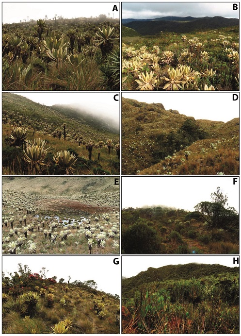 Imágenes de los páramos en cada una de las ocho localidades de muestreo en los tres complejos paramunos incluidos en este estudio. Complejo Los Nevados: A) Salento; B) complejo Chilí-Barragán: Calarcá, C) Córdoba, D) Génova, E) Sevilla, F) tuluá; G) complejo Las Hermosas: Palmira, H) Rioblanco.