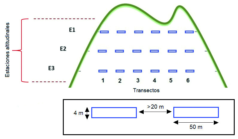 Ejemplo del diseño de muestreo utilizado en este estudio. El número de estaciones varió dependiendo de las condiciones en cada una de las ocho localidades de muestreo (ver texto). Las estaciones de muestreo (E) estuvieron separadas entre sí por 80 - 100 metros de altitud.