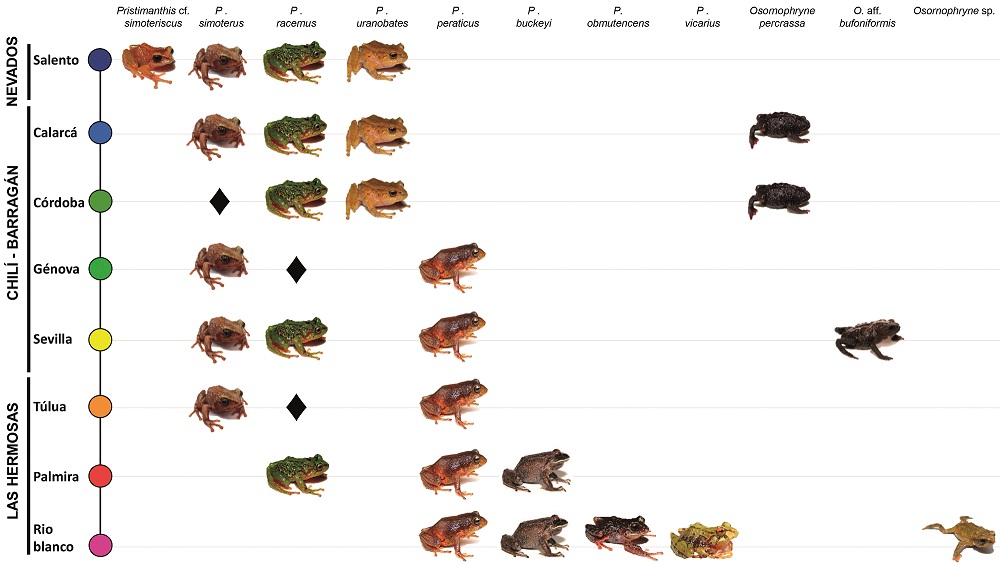 Recambio de especies de anuros entre localidades de muestreo y los complejos paramunos de Los Nevados, Chili-Barragán y Las Hermosas en la cordillera Central, departamentos del Quindío, Valle del Cauca y Tolima, Colombia. Localidades ubicadas de norte (Salento) a sur (Rioblanco). Análisis realizado solo con individuos adultos (ver sección de resultados). Los símbolos de diamante negros denotan la posible presencia de una especie con base en su registro tanto al norte como al sur de la localidad.