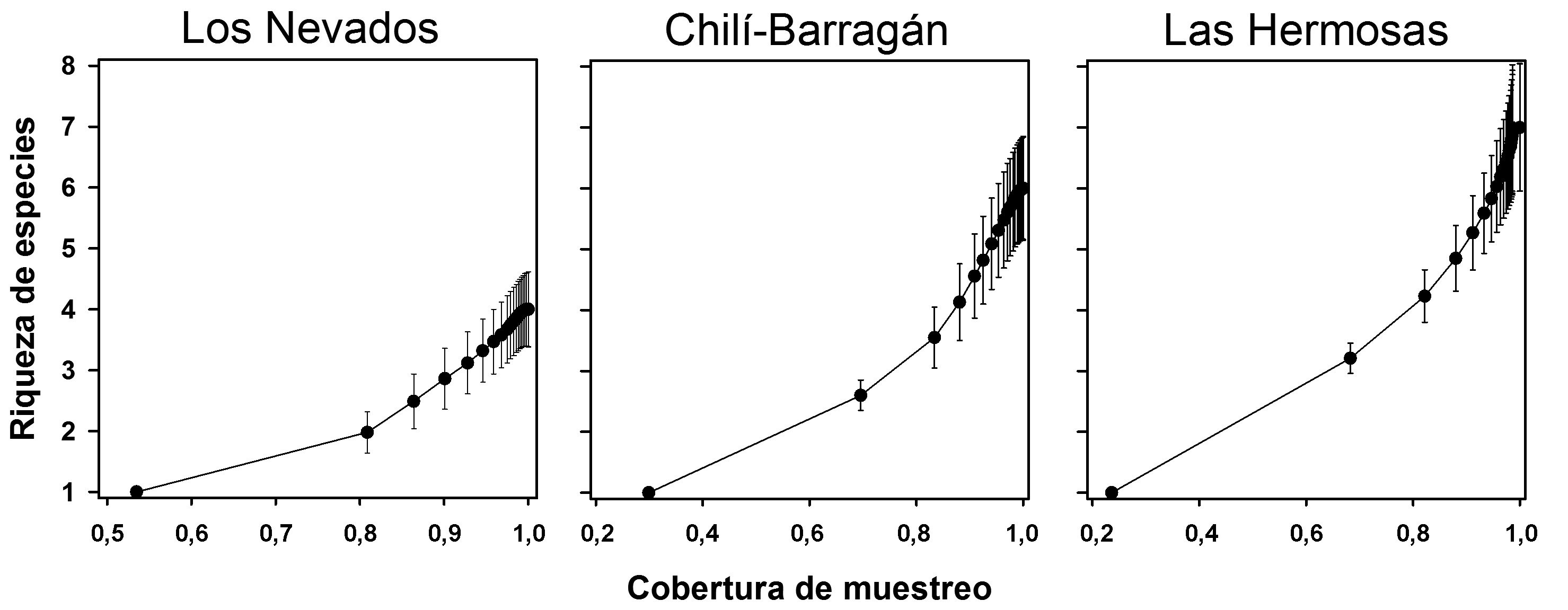 Análisis de cobertura de muestreo para los complejos paramunos de Los Nevados, Chilí-Barragán y Las Hermosas en la cordillera Central, departamentos del Quindío, Valle del Cauca y Tolima, Colombia. Análisis realizado solo con individuos adultos (ver sección de resultados). Las barras verticales corresponden a límites de intervalos de confianza del 95 % para los estimados de riqueza de especie acorde al nivel de cobertura de muestreo.