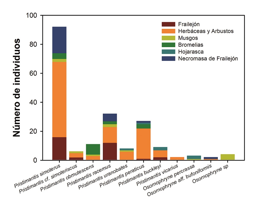 Este análisis de cobertura sugiere que las especies de anuros presentes actualmente en las localidades abarcadas en este estudio fueron incluidas en los registros. La riqueza promedio estimada fue mayor en las localidades de los complejos de Las Hermosas y Chilí-Barragán, con seis y siete especies, respectivamente, y menor en la localidad ubicada en Los Nevados con un estimado promedio de cuatro especies (Figura 5). La mayoría de individuos fue-ron observados en hojarasca o vegetación herbácea y arbustiva (Figura 6); en la localidad de Génova (complejo Chilí-Barragán) a diferencia de las otras localidades no se observaron individuos en brome-lias y frailejones. Todas las especies, excepto Osornophryne percrassa y Osornophryne sp., se observaron durante la noche en ramas y hojas entre 30 y 162 cm de altura, pero cuando fueron registradas en el día, se encontraron ocultas entre la hojarasca, necromasa de frailejón y vegetación a nivel del suelo (< 30 cm altura).