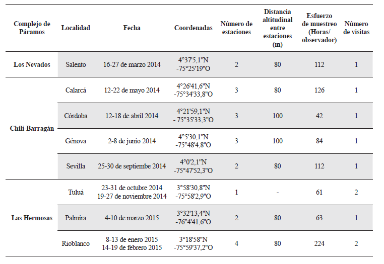 Resumen de las características del muestreo implementado en cada uno de los complejos de páramo y cada una de las localidades de muestreo.