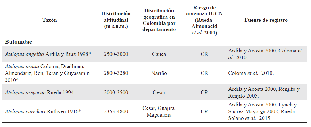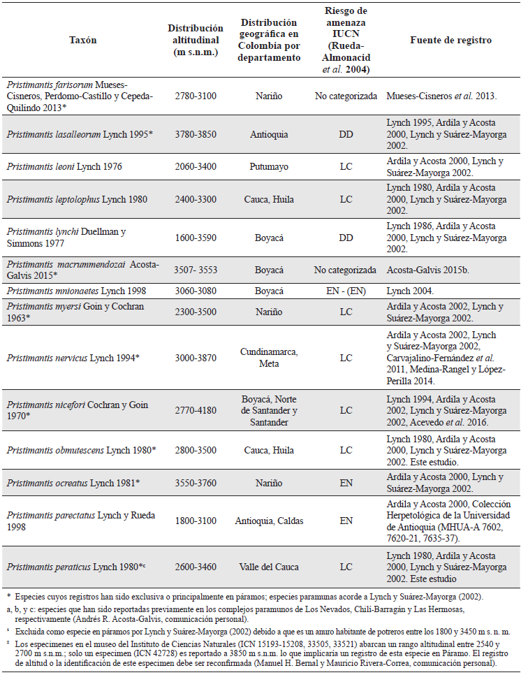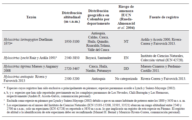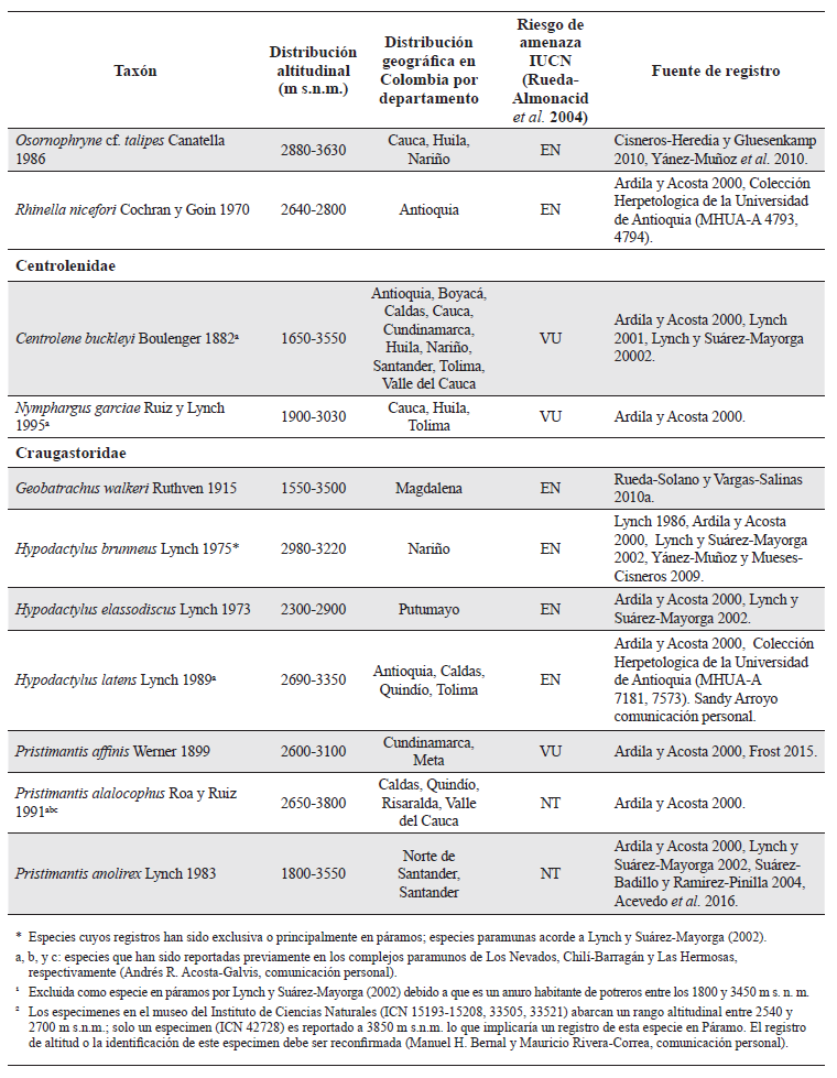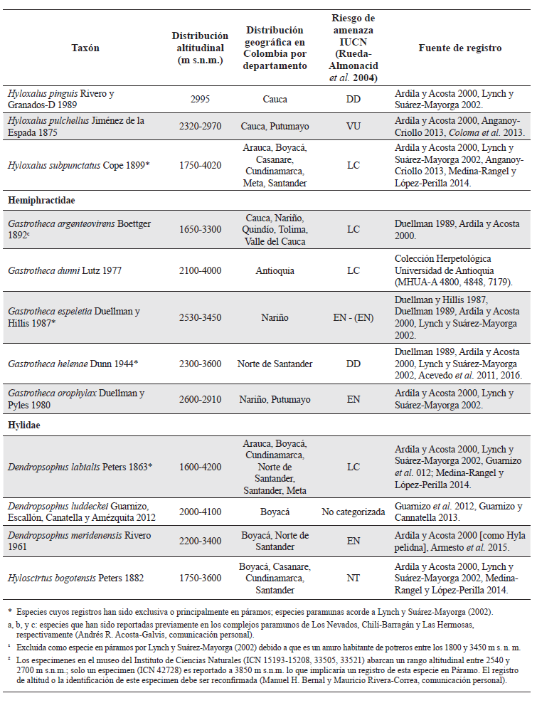 Especies de anuros registrados en páramos de Colombia. Taxonomía actualizada acorde a Frost (2015); distribución altitudinal y por departamentos principalmente acorde a Bernal y Lynch (2008) y Acosta-Galvis (2015) pero complementada con ampliaciones recientes en rangos de distribución por diversos autores (ver columna fuente de registro); riesgo de amenaza según Rueda-Almonacid et al. (2004) y IUCN (http://www.iucn.org/es/): En Peligro Crítico (CR), En Peligro (EN), Vulnerable (VU), Casi amenazada (NT), Preocupación Menor (LC), Datos Deficientes (DD). Especies señaladas con asterisco (*) son aquellas cuyos registros han sido exclusivamente en páramos o principalmente en páramos; especies paramunas acorde a Lynch y Suárez-Mayorga (2002). Especies que han sido reportadas previamente en los complejos paramunos de Los Nevados, Chilí-Barragán y Las Hermosas (Andrés R. Acosta-Galvis, comunicación personal) son señaladas con a, b, y c, respectivamente. Este listado no incluye 16 especies citadas por Ardila y Acosta (2000) pero que acorde a Lynch y Suárez-Mayorga (2002) no poseen registros en este ecosistema y no han habido publicaciones que convaliden su presencia en páramos con espécimenes en colecciones biológicas (¹). Excluida como especie en páramos por Lynch y Suárez-Mayorga (2002) debido a que es un anuro habitante de potreros entre los 1800 y 3450 m s.n.m. (²) Los especímenes en el museo del Instituto de Ciencias Naturales (ICN 15193-15208, 33505, 33521) abarcan un rango altitudinal entre 2540 y 2700 m s.n.m.; solo un espécimen (ICN 42728) es reportado a 3850 m s.n.m. lo que implicaría un registro de esta especie en páramo. El registro de altitud o la identificación de este espécimen debe ser reconfirmada (Manuel H. Bernal y Mauricio Rivera-Correa, comunicación personal).
