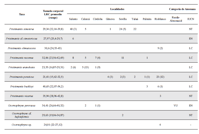 A cada individuo capturado se le registró la fecha y hora de observación, tamaño corporal (longitud rostro-cloaca, LRC), peso, sexo y/o categoría de edad (juvenil, adulto) y la actividad del animal en el momento de registro (saltando, cantando, en amplexus, en reposo). Se registraron los datos sugeridos por Crump y Scott (1994) para la caracterización del microhábitat: ubicación respecto a cuerpos de agua, posición vertical o altura de percha, tipo de sustrato en que se encuentran. Los individuos observados se identificaron en campo por conocimiento previo, descripción en literatura (Lynch 1980, Lynch 1991, Lynch et al. 1996) o su posible presencia en el área (Ruiz-Carranza et al. 1996, Ardila y Acosta 2000, Lynch y Suárez-Mayorga 2002, Bernal et al. 2005, Bernal y Lynch 2008). Debido a la complejidad de la identificación taxonómica de individuos ju-veniles en campo, su asignación a una especie en particular fue con base en algunas características fenotípicas (p. e. morfología de dedos y tubérculos), sin embargo, esta asignación es tentativa y nuestros análisis cuantitativos se basan solo en individuos adultos. Algunos individuos por especie fueron colectados en cada localidad y preparados acorde al protocolo establecido por Cortez et al. (2006) para su determinación en laboratorio y posterior donación a las colecciones zoológicas del Instituto Alexander von Humboldt y la colección de Herpetología de la Universidad del Quindío (ver Anexo 1). En los muestreos se siguió el protocolo de bioseguridad planteado por Aguirre y Lampo (2006). El estado de amenaza de las especies fue catalogado con base en Rueda-Almonacid et al. (2004) y la IUCN (http://www.iucnredlist.org/).