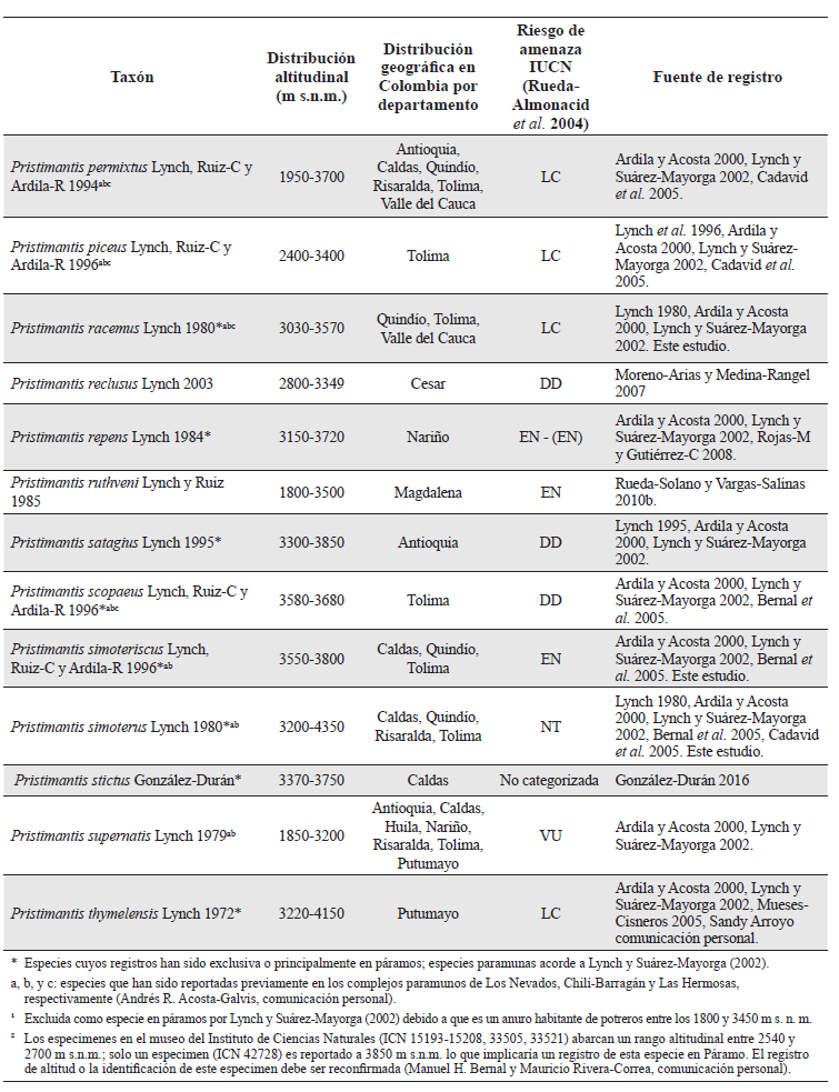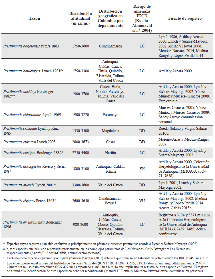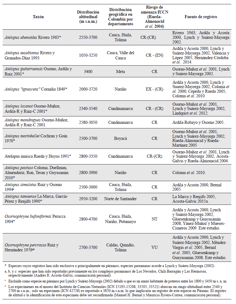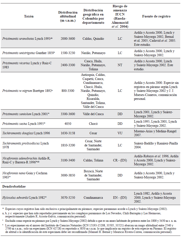 Una revisión de la fauna de anfibios presentes en los ecosistemas de páramo en Colombia fue realizada por Ardila y Acosta (2000). Con base en registros propios, especímenes en colecciones biológicas e información dispersa en literatura, dichos autores concluyen que la fauna de anuros en los páramos de Colombia alcanza una riqueza de hasta 87 especies. No obstante, Lynch y Suárez-Mayorga (2002) realizan un nuevo análisis y argumentan que la mayoría de especies citadas por Ardila y Acosta (2000) no son estrictamente del ecosistema paramuno, sino más bien especies de bosques andinos que pueden establecerse en áreas de páramo, favorecidas parcialmente por perturbación antropogénica. Posterior a estas dos revisiones, varios autores han descrito nuevas especies de anuros que viven en páramo, o han realizado registros que expanden la distribución altitudinal de especies no observadas previamente en este ecosistema (p. e. Rueda-Solano y Vargas-Salinas 2010a, b; Perdomo-Castillo y Mueses-Cisneros 2009; Guarnizo et al. 2012, Acosta-Galvis 2015b).