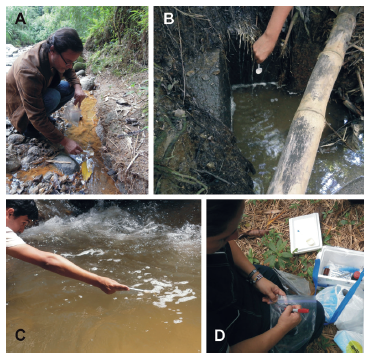 Sitios de recolección de espumas del río Frío: A) tributario directo del río. B) Caño. C) Río Frío. D) Conservación de las muestras.