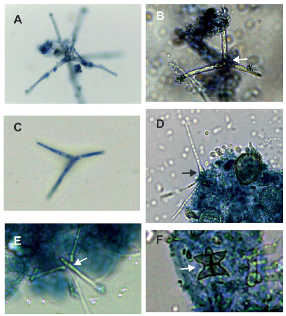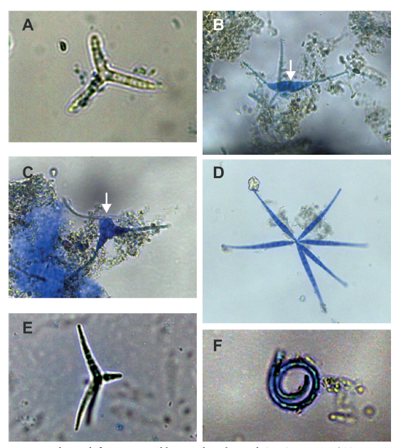 Algunos hifomicetos ingoldianos colectados en el río Frío. Parte 2. A) Tripospermum sp.? B) Lemonniera sp. C) Alatospora sp. D) Clavatospora tentacula. E) Triscelophorus curviramifer. F) Scutisporus brunneus.