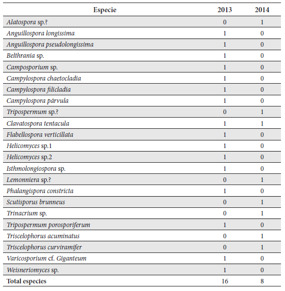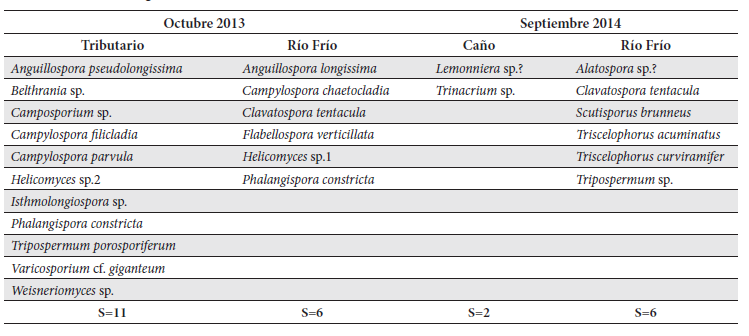 Durante los muestreos 2013 y 2014 se registraron 23 taxa de hifomicetos ingoldianos, para octubre de 2013 se reportan 16 taxa y para septiembre de 2014 ocho taxa. Las figuras 4 y 5 muestran once de las especies colectadas. En ambos años se colectaron espumas de pequeños tributarios o caños que recogen material de la zona riparia, además del río Frío (Tabla 1).