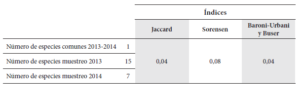 Para determinar la similitud entre los dos periodos de muestreo se calcularon los índices de Jaccard, Sorensen y Baroni-Urbani y Buser según Krebs (1999).
