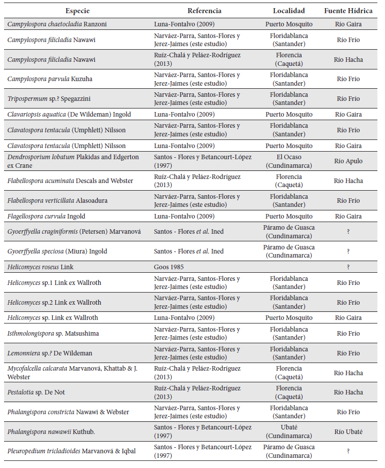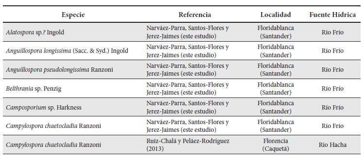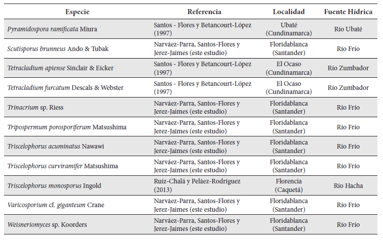 El número de nuevos registros de hifomicetos ingoldianos en este estudio, muestra la gran diversidad de este grupo y también al desconocimiento de ellos en Colombia, debido a la falta de investigaciones en esta área. Hay conocimiento de algunas especies para los ríos Apulo (una especie), Ubaté (dos especies), Zumbador (dos especies), Páramo de Guasca (dos especies) (Santos-Flores y Betancourt-López 1997); Gaira, cinco especies (Luna-Fontalvo 2009); Hacha, seis especies (Ruíz-Chalá y Peláez-Rodríguez 2013) y el presente estudio (23 especies) (Anexo 1), que indican un gran potencial de estos hongos en los ríos alto andinos.