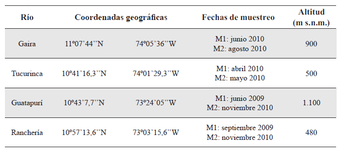 El estudio se realizó en la Sierra Nevada de Santa Marta (SNSM), situado al norte de Colombia, entre los 10°12'05'' - 11°20'11'' N y los 72° 36?16'' - 74º12’49’’ W. Posee más de 18 cuencas, las cuales abastecen a los departamentos del Magdalena, Cesar y La Guajira. En dichas cuencas la disminución de la cobertura vegetal asociada a sus fuertes pendientes y la estacionalidad de las lluvias acentúan la inestabilidad del régimen hídrico provocando variaciones en sus caudales (Pro-Sierra 1998). El sector norte de la SNSM bordea el Mar Caribe desde las tierras del sur de La Guajira hasta la desembocadura del río Manzanares en Santa Marta; el sector occidental limita con el Mar Caribe, la Ciénaga Grande de Santa Marta y la planicie del río Magdalena y por último, el sector oriental está limitado por el río Cesar y el río Ranchería al Norte (Pro-Sierra op. cit.). En este estudio se establecieron cuatro estaciones de muestreo en tres sectores de la SNSM, los cuales corresponden al sector noroccidental (río Gaira) que posee vegetación ribereña bien conservada, el sector suroccidental (río Tucurinca) también con un bosque ribereño en buen estado de conservación y el sector oriental (Ranchería y Guatapurí), que cuenta con poca cobertura vegetal y gran disponibilidad de luz. Estos ríos se encuentran ente los 500 y 1100 m s.n.m. (Tabla 1).