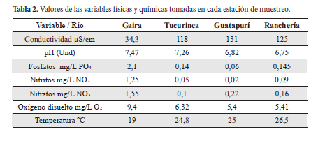mEl río Gaira presentó los valores más altos de fosfatos (2,1 mg/L P04), nitritos (1,25 mg/L N02) y nitratos (1,55 mg/L N03). El valor mayor de conductividad se presentó en los ríos Guatapurí y Ranchería (131 µS/cm y 125 µS/cm) y el menor en el Gaira (valores promedios de 34,3 µS/cm). Así mismo, en esta estación se presentó el mayor registro de oxígeno disuelto (9,4 mg/L 02) y en la estación Ranchería el menor (5,4 mg/L 02). La mayor temperatura (26,5 ºC) se observó en el río Ranchería y la menor (19 ºC) corresponde al río Gaira. El pH en los ríos Gaira y Tucurinca presentó valores por encima de la neutralidad (7,4 y 7,2) mientras que en los ríos Guatapurí y Ranchería presentó valores por debajo de la neutralidad (6,8 y 6,7); Sin embargo, esta variable siempre estuvo cercana a la neutralidad (Tabla 2).
