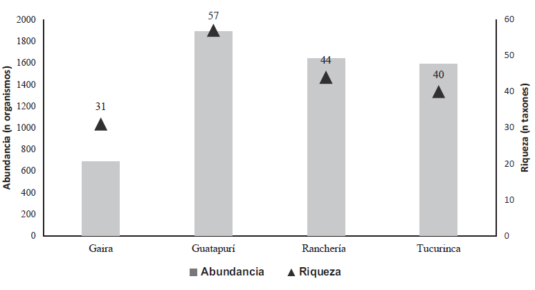 En general, los 72 taxones encontrados en este estudio, muestran que estos ríos tienen alta riqueza de géneros. Estudios similares realizados por Chará et al. (2009) evidenciaron 211 géneros de macroinvertebrados acuáticos en 28 quebradas de municipios del Valle del Cauca. Zúñiga et al. (2013) también encontraron una alta riqueza de insectos acuáticos en quebradas de la región andina colombiana. Sin embargo, la baja diversidad encontrada puede explicarse por las intervenciones de carácter antrópico (Bernal et al. 2006), tal como es el caso de las estaciones Gaira y Tucurinca. En este estudio no se evaluó el efecto antrópico, pero durante los muestreos se evidenció que los sitios con menor diversidad tenían alto impacto por actividades humanas; además, la abundancia y distribución de los insectos acuáticos en cada estación mostraron relación con la precipitación, coincidiendo con lo propuesto por Jacobsen et al. (1997) quienes sugieren que la abundancia y la composición de los insectos acuáticos están relacionadas con las altas temperaturas y periodos de lluvias. No obstante, para Giacometti y Bersosa (2006) en épocas de alta precipitación no favorece el registro de dichos insectos acuáticos.