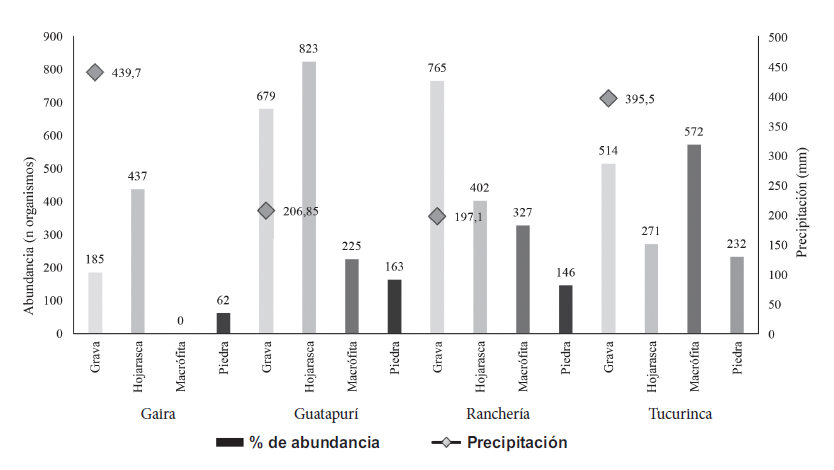 Abundancia de macroinvertebrados acuáticos en los ríos muestreados (Gaira, Tucurinca, Guatapurí y Ranchería) en los diferentes microhábitats (grava, hojarasca, macrófita y piedra) y precipitación promedio multianual (mm) de las estaciones climáticas más cercanas.