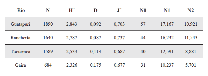 En cuanto a la diversidad, la serie de los números de Hill fue mayor en el río Guatapurí, mostrando que este río tiene una alta riqueza y diversidad en comparación con Gaira y Tucurinca, de acuerdo a los criterios propuestos por Moreno et al. (2011), quienes sugieren que usando los números efectivos, se mejoraría la interpretación de la diversidad entre comunidades, ya que se agrupan diferentes componentes y se pueden hacer comparaciones entre diferentes sitios. Los valores de equidad de Pielou registrados en este trabajo, evidencian que todos los taxones no son igualmente abundantes. Rivera-Usme et al. (2008) en su estudio, encontraron la mayor diversidad y equidad en quebradas del departamento del Quindío, justificando que estos resultados pueden estar asociados a características propias de los sistemas y las pocas limitaciones fisicoquímicas que impone el medio al establecimiento de la fauna acuática y a la variedad de microhábitats presentes. Por su parte, Pino-Selles y Bernal-Vega (2009) reportaron una equidad de Pielou para cinco meses de muestreo entre 0,57 y 0,78, en donde se observó que variaba con el tiempo, posiblemente por deberse a un bosque de galería con reducida perturbación en la parte alta-media del río David en Panamá.