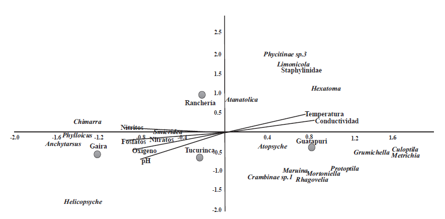 En el Análisis de Correspondencia Canónica (ACC) los dos primeros ejes suman en sus varianzas un 90,89 %. El río Gaira presentó altas abundancias de Phylloicus, Anchytarsus y Helicopsyche lo cual se relacionó con los altos valores de oxígeno disuelto (9,4 mg/L 02), nitratos (1,5 mg/L N03) y nitritos (1,2 mg/L N02). El río Ranchería evidenció altas abundancias de Chimarra y Atanatolica asociado con altos valores de nitritos (0,09 mg/L N02). El río Tucurinca, fue definido por las altas abundancias de Smicridea y Helicopsyche, los cuales se asociaron con los mayores niveles de pH (7,2). Para el río Guatapurí, las variables como temperatura y conductividad estuvieron relacionadas con las altas abundancias de los taxones Culoptila, Protoptila, Mortoniella, Atopsyche y Grumichella (Figura 4).
