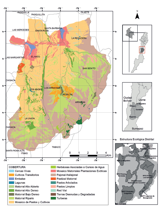 Cobertura de la tierra para las microcuencas Curubital, Mugroso, Chisacá y Regadera del Distrito Capital a escala 1:25.000 y su ubicación relativa. Elaboración propia, fuentes: cartografía SDA (2011), Igac (2014).