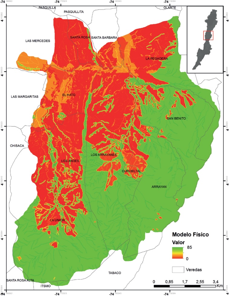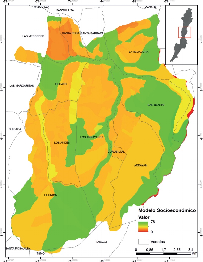 Para el segundo criterio (socioeconómico), se usaron las áreas abastecedoras del recurso hídrico, tipo de uso del suelo potencial, capas de la EED y tamaño de predios. Se incluyeron las áreas abastecedoras de acueductos como zonas de protección del recurso hídrico y abastecimiento para los pobladores, lo cual es una razón de peso para las comunidades locales (Tabla 1). El tipo de uso del suelo es una propuesta que define cual es el uso más apropiado de una zona de acuerdo a sus características de suelo, relieve, vulnerabilidad y amenaza. Según esto, se clasifica en áreas donde el uso puede ser urbano y agrícola (el que mayor resistencia presenta), o el uso no es permitido y el área debe ser conservada (la resistencia es menor).