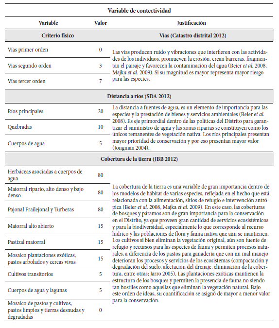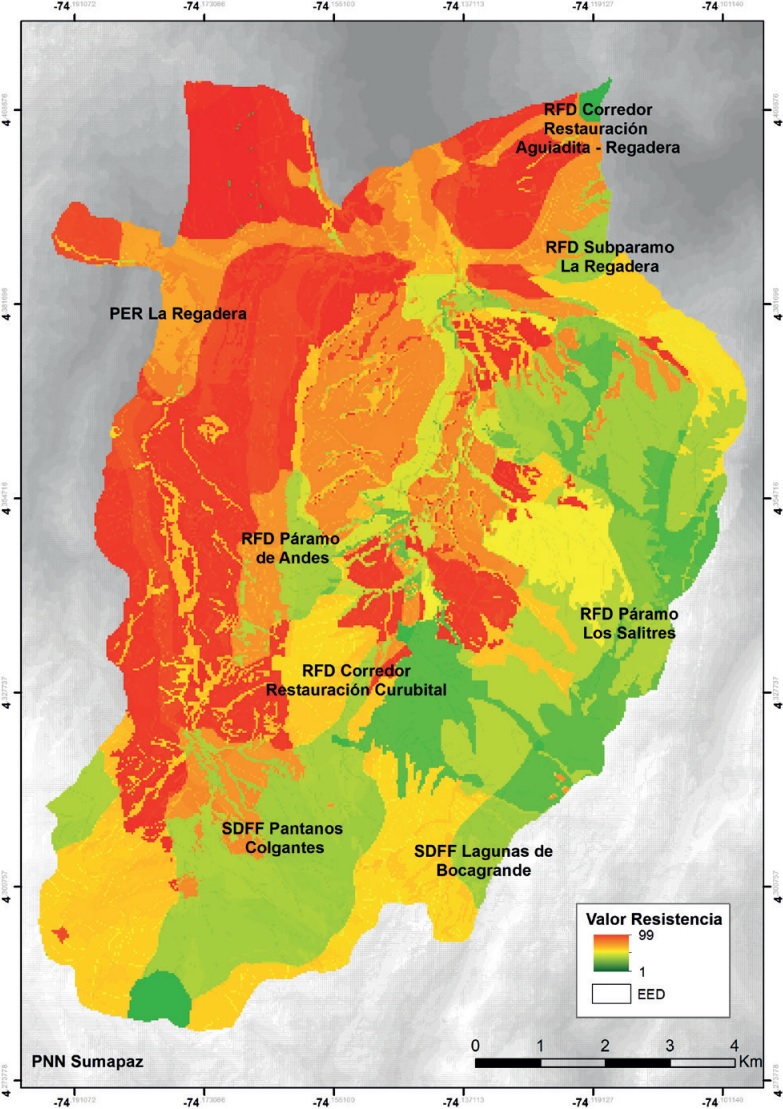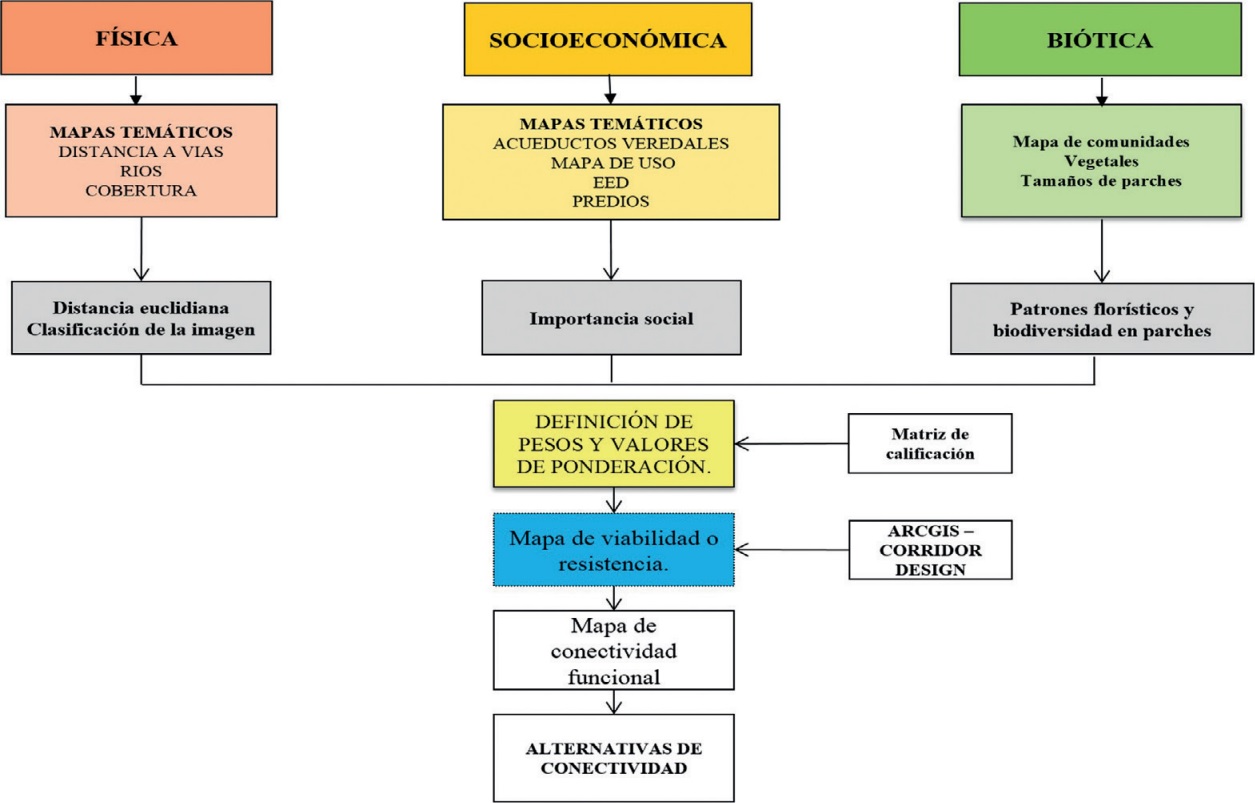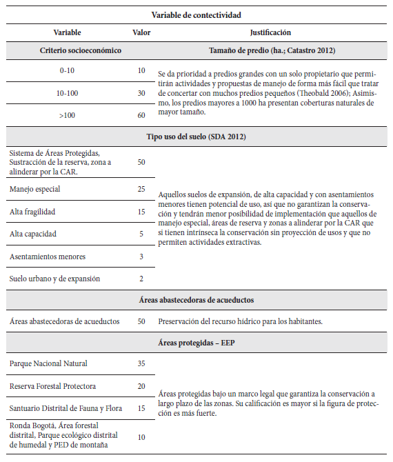 Con base en la cartografía existente, salidas de verificación en campo y diferentes reuniones realizadas con expertos, se definieron tres criterios identificados como importantes en la selección de áreas para la zonificación espacial de la zona. Estos tres criterios se denominaron: 1) biótico, 2) socioeconómico y 3) físico, para construir un modelo de resistencia que sirviera de base para modelar conectividad. En estos términos, se tomó la conectividad como aquellas zonas que facilitan el movimiento de las especies y le dan continuidad al paisaje, con base en una grilla de resistencia y que conectan dos parches de hábitat los cuales se definieron con base en dos áreas protegidas que presentan la categoría de protección más alta en la EED (Adriaensen et al. 2003, Beier et al. 2008, McRae et al. 2008).