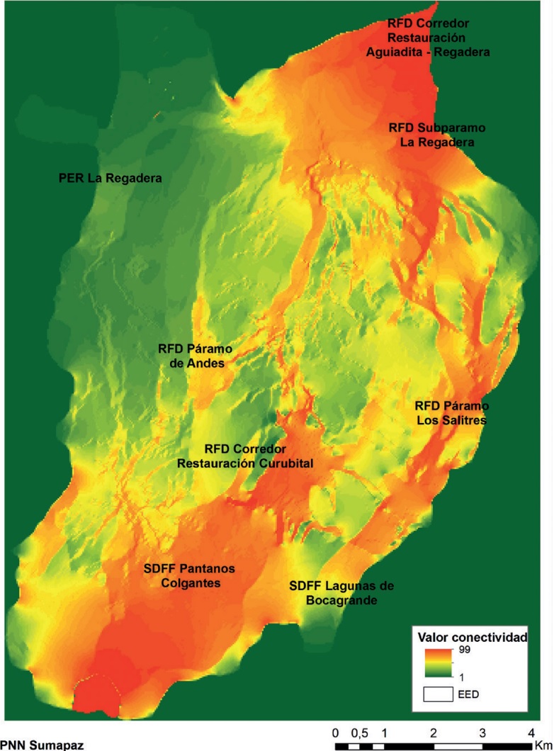 La escogencia de la EED, buscaba centrar la zonificación en las áreas protegidas consideradas como fuente y conservación de las especies, las cuales deben contar con un manejo adecuado que garantice a largo plazo su conservación ya que no tendrá ningún sentido conectar zonas que no proveerán los recursos necesarios para supervivencia de las especies (Gurrutxaga 2004, Hodgson et al. 2011).