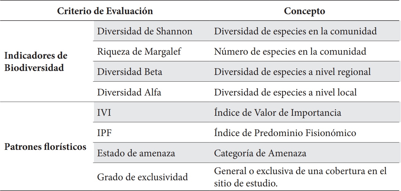 Criterios planteados para la evaluación de las comunidades vegetales para el criterio biótico.