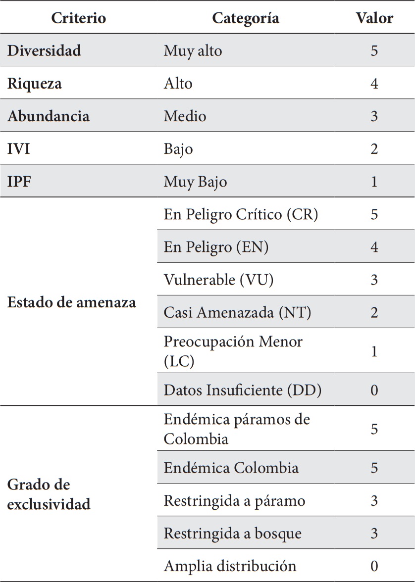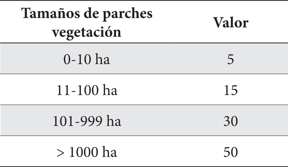 Cada criterio presentó una categoría de mayor a menor valor, a la cual se le asignó un valor de uno a cinco (Tabla 3). Con ello se construyó una matriz de valores acumulados por comunidad levantada, donde la ubicación de cada comunidad se asoció a un parche dentro del mapa de coberturas. Cabe aclarar que para el valor de los patrones florísticos, se suman los valores presentados por cada una de las especies presentes en cada comunidad.