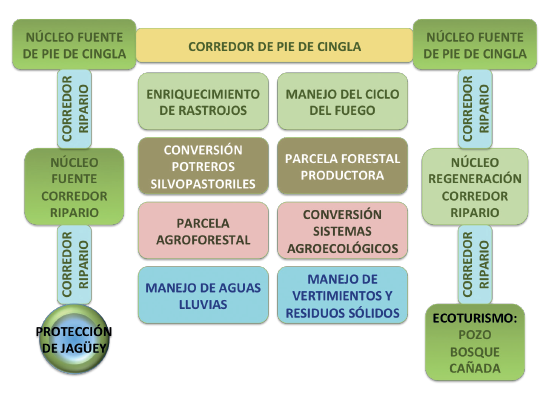 La aplicación para finca campesina de valle colgante (Figura 10) ilustra la estrategia. Los diseños específicos de restauración en cada caso combinan seis elementos principales: