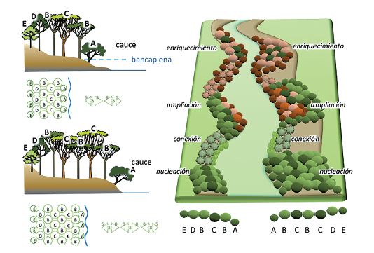 Ejemplo de tipología variable para la restauración del bosque ripario de las cañadas medias. Paisaje campesino de valles colgantes. A) arbolitos y arbustos riparios. B) especies dominantes del bosque de cañada. C) especies raras o amenazadas. D) dominantes del bosque de ladera. E) especies resistes al fuego y pastoreo.