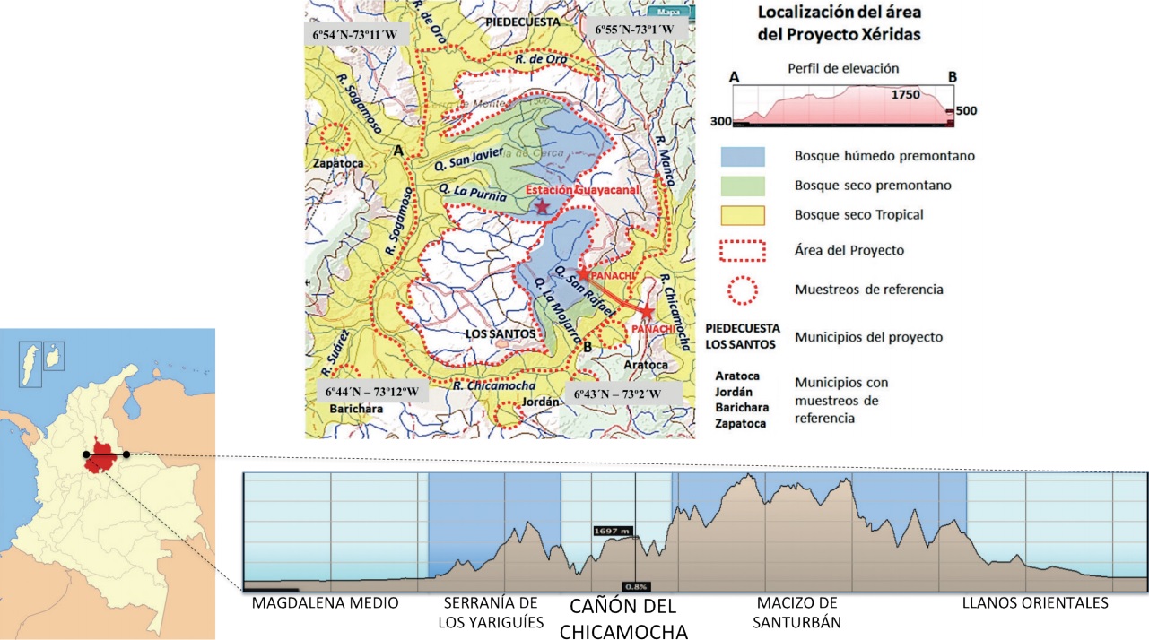 La mesa de Xéridas es un altiplano que se eleva desde los 300 m s.n.m. en el fondo del cañón del Sogamoso, o los 500 m s.n.m., en el cañón del Chicamocha, hasta los 1600-1810 m s.n.m. en las partes altas (Alto de Tabacal). Los profundos cañones que la rodean conforman un cinturón casi continuo de bs-T (Figura 1): por el norte, el valle del río de Oro; por el oriente, el cañón del río Manco; por el sur, el curso bajo del río Chicamocha, entre la desembocadura del Manco (Pescadero) y la unión del Suárez con el Chicamocha (Las Juntas); y por el occidente, el curso alto del río Sogamoso (que se forma por la unión del Suárez y el Chicamocha), entre Las Juntas y desembocadura de la quebrada El Monte.