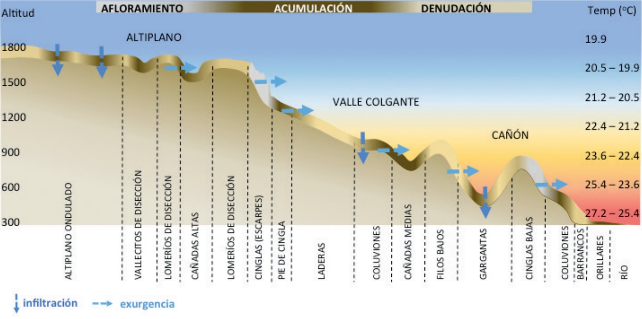 Cada uno de los tres paisajes que se diferencian marcadamente en el gradiente físico vertical determina el desarrollo de comunidades vegetales muy distintas y condiciones de regeneración así mismo diferenciadas con un fuerte encadenamiento vertical de los procesos biofísicos que se concentran en las cañadas. Estos ambientes han determinado distintas formas de ocupación y uso a lo largo de la historia que han acentuado la diferenciación en socioecosistemas correspondientes.