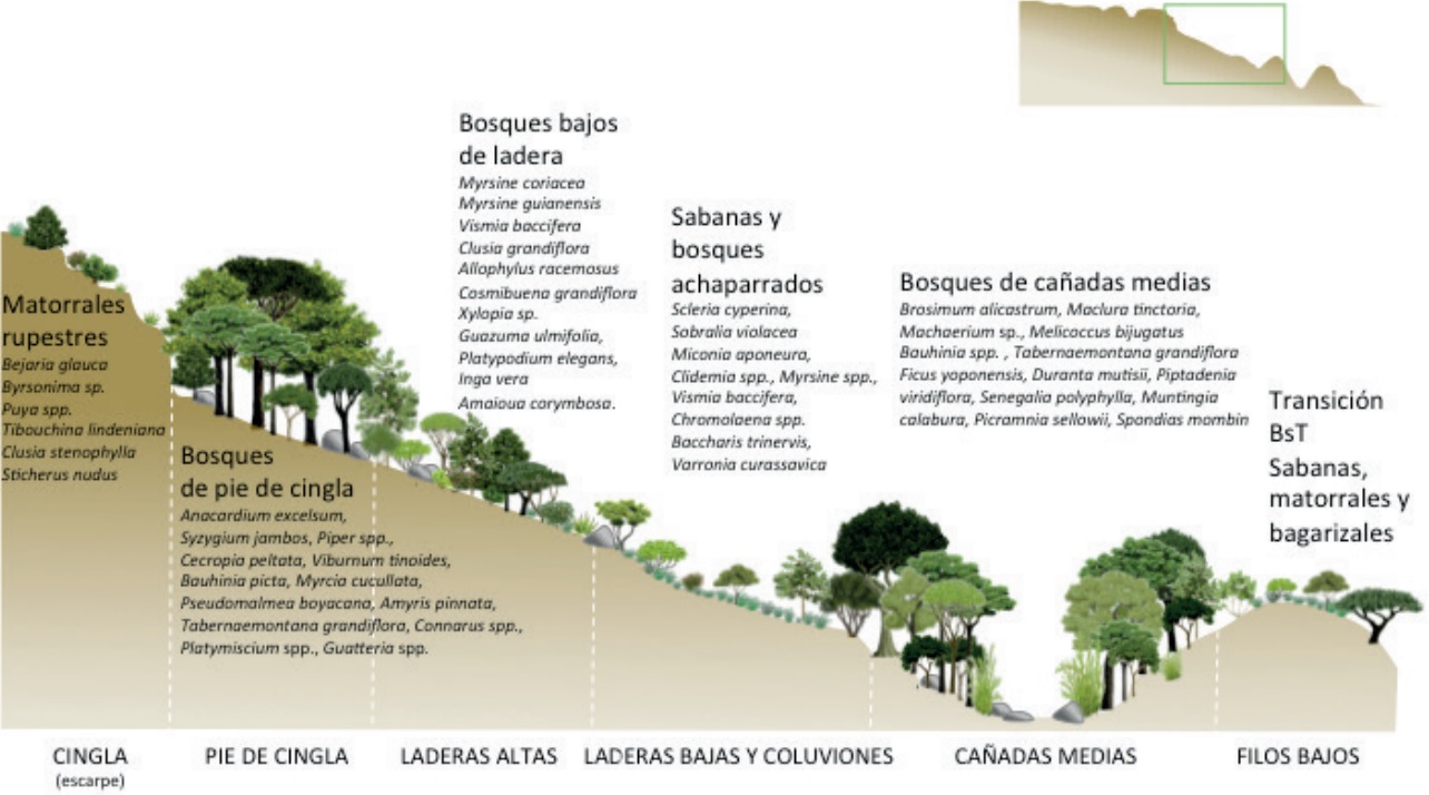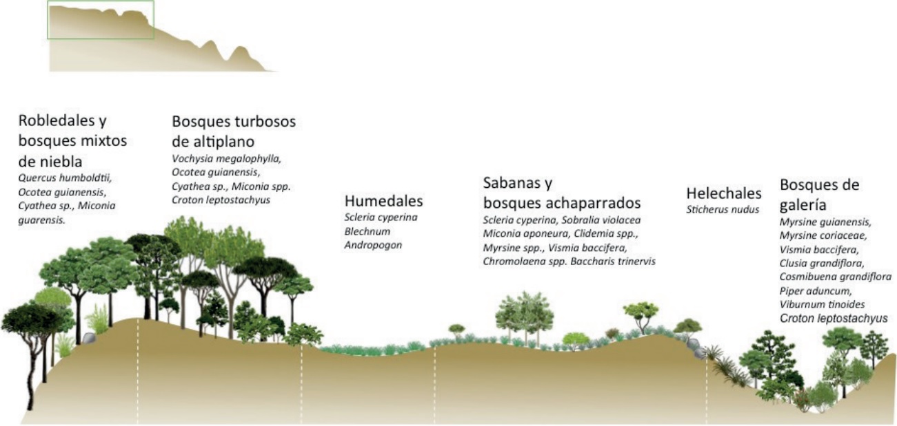 El paisaje de altiplano (Figura 3) se caracteriza por una matriz dominante de sabanas sobre oxisoles lavados limitados por roca y laterita, con abundantes elementos leñosos en forma de parches boscosos, agregados leñosos, árboles y arbustos dispersos y bosques de galería en los vallecitos entre los lomeríos. Localmente se presentan suelos turbosos azonales sobre los que se desarrollan parches mayores de bosque de turbera y pantanos estacionales de graminoides. Los escarpes del borde norte del altiplano presentan bosques de niebla premontanos y montano bajos, más afines a los de Santurbán – Almorzadero que al paisaje general de la mesa de Xéridas. Los escarpes o cinglas presentan matorrales rupestres que incluyen pequeños parches de bosques achaparrados.