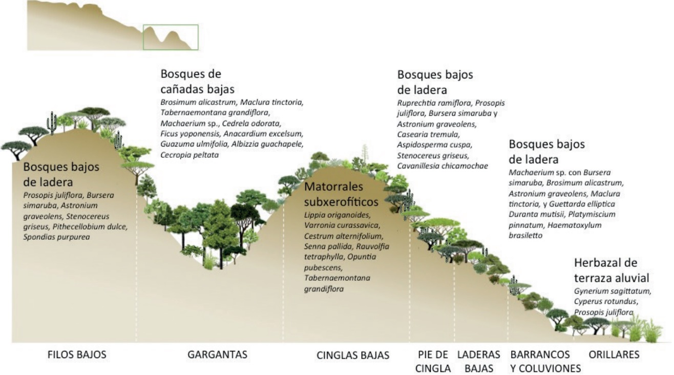 En las condiciones ambientales extremas de los bosques secos interandinos las cañadas han sido escenarios claves para la supervivencia y la adaptación, lugares privilegiados para la vecindad de los asentamientos humanos (Ardila 2015), donde el severo régimen de sequedad, erosión y radiación se mitiga (Vodde et al. 2010, Brown et al. 2011).