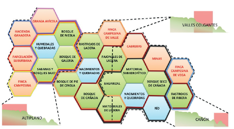 Escenarios socioecológicos identificados en la mesa de Xéridas: altiplano, valles colgantes y cañón. Las líneas de colores delimitan los ambientes en donde más incide cada sistema de alteridad o modo de vida que interactúa en el socioecosistema. Por ejemplo, la línea roja bordea los ambientes transformados por la parcelación suburbana de altiplano; la línea naranja los ambientes con que se relaciona la finca campesina de valle colgante. Una mayor cantidad de líneas muestra los ecosistemas más presionados, que en este caso, corresponden a los del altiplano.