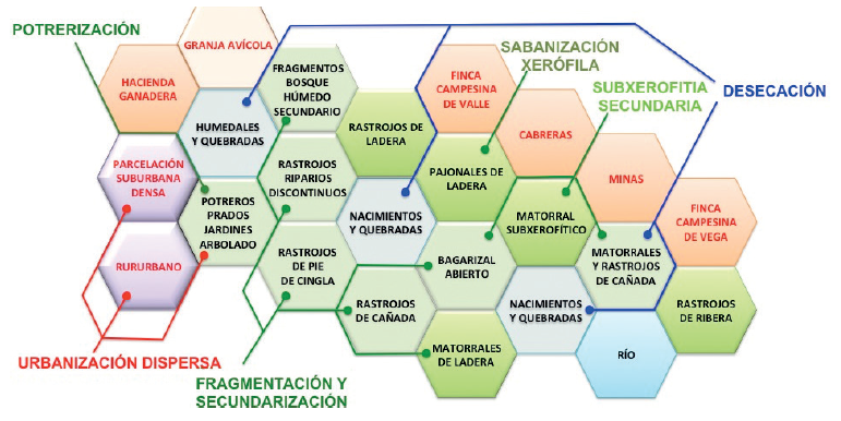 En el patrón de alteración del altiplano dominan la fragmentación y secundarización progresiva de los remanentes de bosques de niebla y bosques de galería, el reemplazamiento de las sabanas naturales por pastos introducidos, la desecación y contaminación hídrica de las cuencas altas y humedales y la expansión de jardines y prados arborizados de las parcelaciones (Figura 7). Todos estos procesos son parte de la dinámica territorial suburbana, donde la mezcla de agroindustria, vivienda y comercio se superpone a los elementos persistentes del pasado, artificiales y naturales: fincas campesinas, fincas cafeteras, sabanas naturales y remanentes forestales.