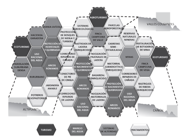 En la escala media la estrategia se concentra en la organización de herramientas de paisaje para conformar una estructura ecológica de microcuenca, entendidas como aquellas acciones que se superponen en un paisaje dado para promover los cambios físicos (pero también sociales), que favorecerán la recuperación y la permanencia de la biodiversidad (Lozano-Zambrano 2009). El modelo se concentra en la recuperación y protección del corredor vertical de cañada conformado por los humedales del altiplano, nacimientos y los distintos tipos de bosque ripario (Figura 9).