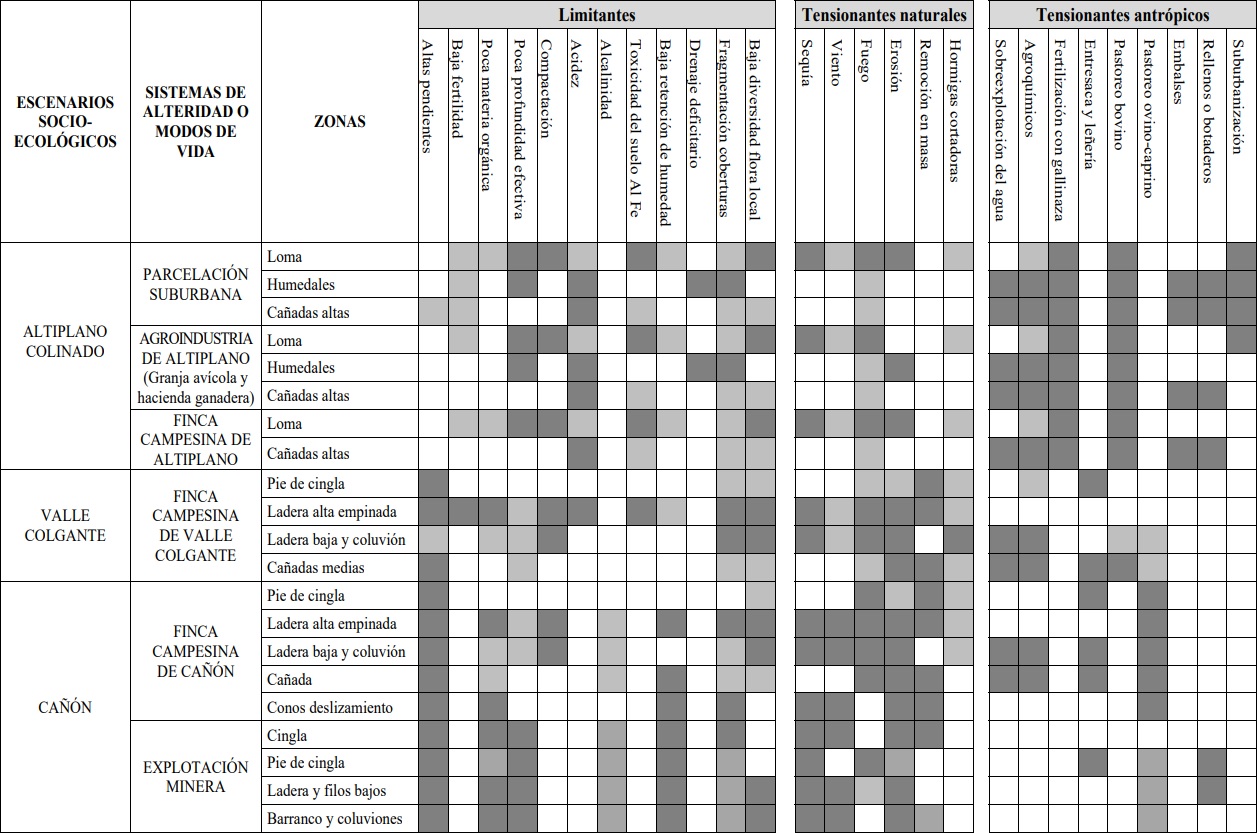 Valoración de limitantes y tensionantes para cada una de las zonas físicas identificadas en los escenarios socioecológicos.