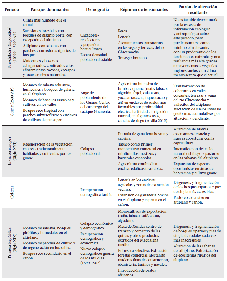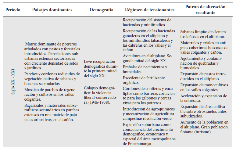 El concepto de “paisaje estratificado” propuesto por Hourdequin y Havlick (2015) corresponde mejor a la situación de la Mesa de Xéridas y el cañón del bajo Chicamocha – alto Sogamoso pues: 1) existe una historia larga y compleja de disturbios, 2) muchos de los cambios acumulados son irreversibles (p.e. la entresaca selectiva de los bosques más cercanos a los centros de poblamiento y los pastos introducidos) y 3) el sistema actual tiene también un valor como resultado histórico. Así, en el altiplano se combinan los suelos y las geoformas del Mioceno con las sabanas del pleistoceno, los bosques del holoceno, elementos del paisaje cafetero y ganadero de los siglos XIX y XX y la suburbanización actual. En los valles y el cañón vemos superposición de formas y espacios de producción y habitación de los guanes que han perdurado a través de los sistemas campesinos que los tomaron como base. Los rastrojos y bosques son producto de varios episodios de perturbación y regeneración bajo distintos regímenes de tensionantes, desde la agricultura indígena, a la ganadería hispánica y la finca modernizada por la motobomba, la motosierra y los agroquímicos de la revolución verde.