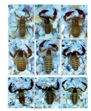 Morfos de las especies. A) Tridenchthnonius, ICN-APs-412. B) Ideobisium puertoricense Muchmore, 1982, ICN-APs-192. C) Ideobisium peckorum Muchmore, 1982, ICN-APs-033. D) Apolpium, ICN-APs-241. E) Pachyolpium, ICN-APs-060. F) Chernetidae, ICN-APs-118. G) ICN-APs-176. H) Parachernes, ICN-APs-084. I) Withiidae, ICN-APs-413. La escala equivale a 1 mm.