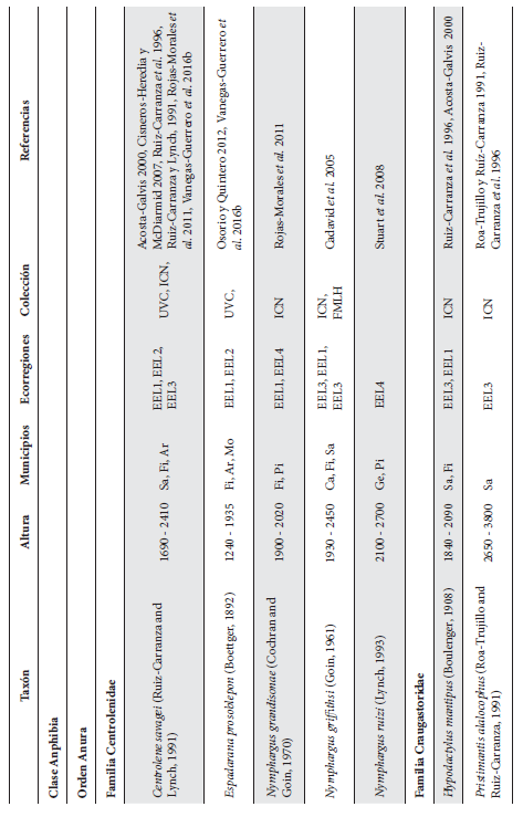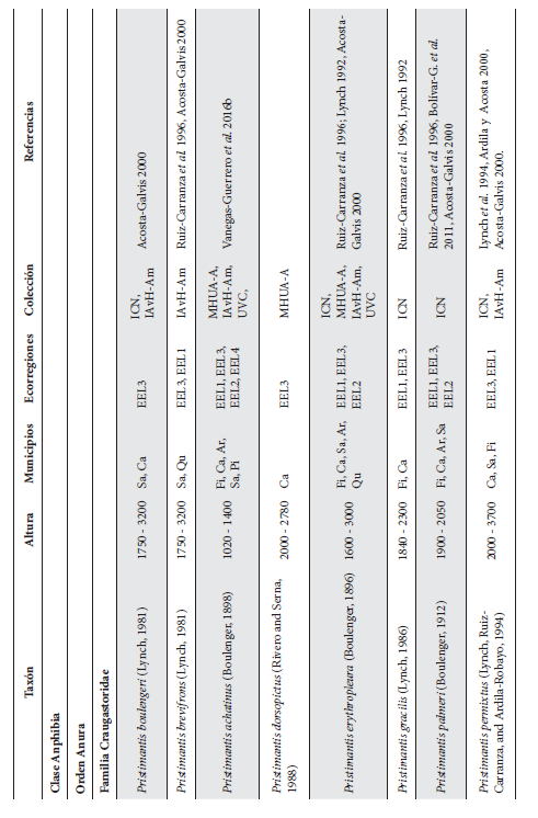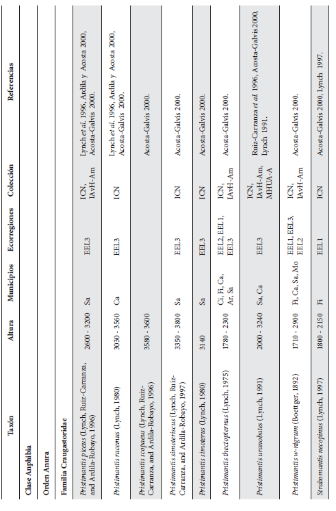 Bernal, M. H. y J. D. Lynch. 2008. Review and analysis of altitudinal distribution of the andean anurans in Colombia. Zootaxa 1826: 1-25