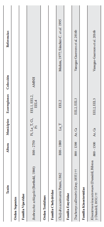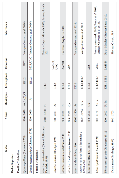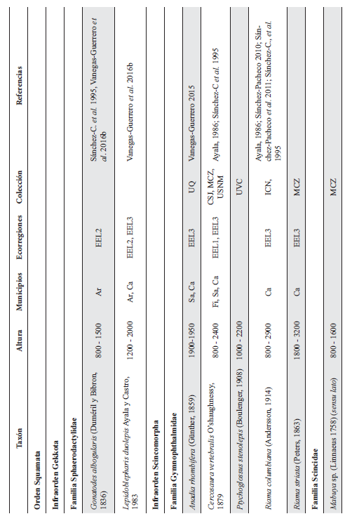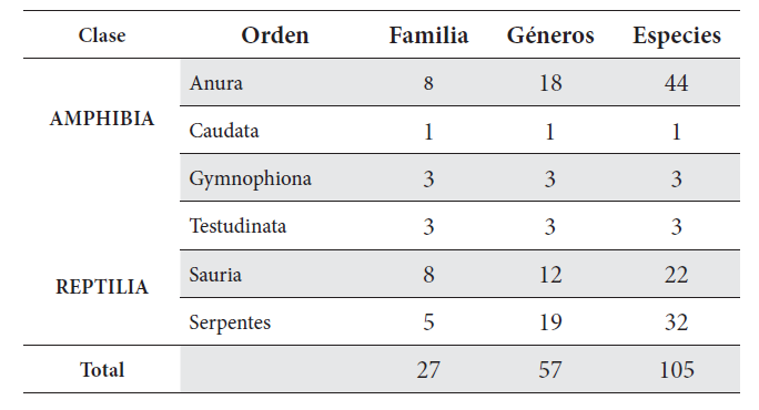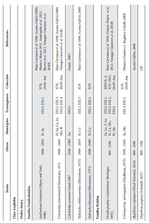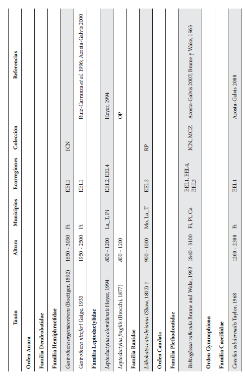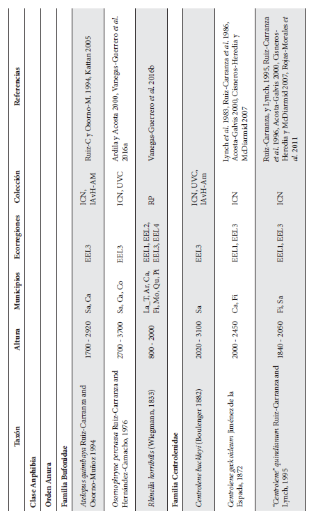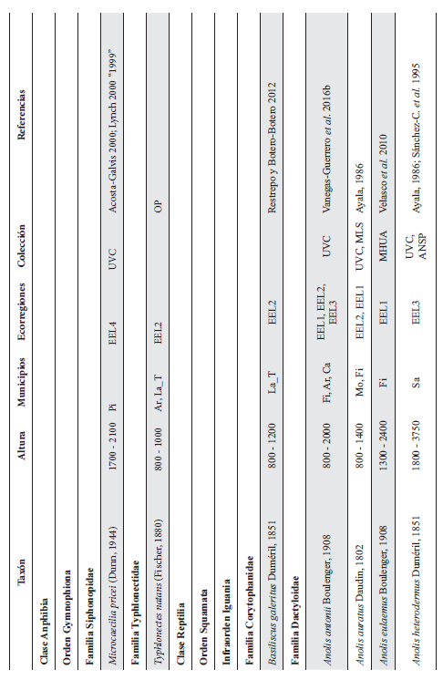 La información fue obtenida a partir de fuentes de bibliografía y registros disponibles en las bases de datos en línea del Instituto de Ciencias Naturales (ICN), Instituto de Investigación de Recursos Biológicos Alexander von Humboldt (IAvH), Museo herpetología de la Universidad de Antioquia (MHUA–A), Colección de anfibios y reptiles de la Universidad del Valle (UVC), Fundación Miguel Lillo (FML), Museo de La Salle – Universidad de La Salle (MLS), American Museum of Natural History, New York, USA (ANSP), Museo de Historia Natural, Colegio San José, Medellín, Colombia (CSJ), Museum of Comparative Zoology, Harvard University, Cambridge, Massachussetts, USA, (MCZ), United States National Museum, Smithsonian Institution, Washington, D.C., USA (USNM). La nomenclatura usada en este listado sigue las propuestas taxonómicas de Pyron y Wiens (2011) para anfibios y Uetz y Hošek (http://www.reptile–database.org, acceso: 24/07/2016) para reptiles.