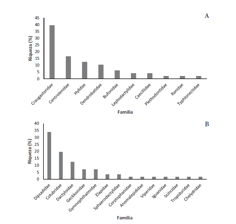 La herpetofauna del Quindío se compone de 105 especies: 48 anfibios y 57 reptiles (Anexo 1, Tabla 1). Entre estas, los anuros representan el 41 % de las especies, seguido de serpientes con 32 % (30 sp.) y saurios con un 20 % (22 sp.). Otros grupos como Caudata (1 %), Gymnophiona (3 %) y Testudinata (4 %) fueron los menos representativos de la riqueza del departamento. Se registró un total de 12 familias de los tres órdenes de anfibios. Ocho familias de anuros, tres de gimnofiones y una de caudados (Figura 2A). Craugastoridae fue la familia más diversa (19 sp.; 39,58 %), seguida por Centrolenidae (8 sp., 16,66 %) y Bufonidae (3 sp., 6,25 %). En contraste, las familias con menor diversidad fueron Hemiphractidae y Leptodactylidae (2 sp., 4,16 % cada una) y Ranidae, Caeciliidae, Siphonopidae, Plethodontidae y Typhlonectidae (1 sp. cada una).