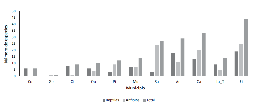 La mayor parte de los registros estuvieron localizados sobre la zona norte del departamento (Figura 3), en los municipios de Filandia (44 sp.), Calarcá (33 sp.), Armenia (29 sp.) y Salento (27 sp.). Mientras que La Tebaida (7 sp.), Montenegro (7 sp.), Pijao (5 sp.), Quimbaya (4. sp.), Circasia (2 sp.) y Génova (1 sp.), presentaron los registros más bajos. En contrastante la relación entre riqueza anfibios/reptiles en diferentes municipios como Salento que presenta registros de 34 especies de anfibios y solo dos registros de reptiles.