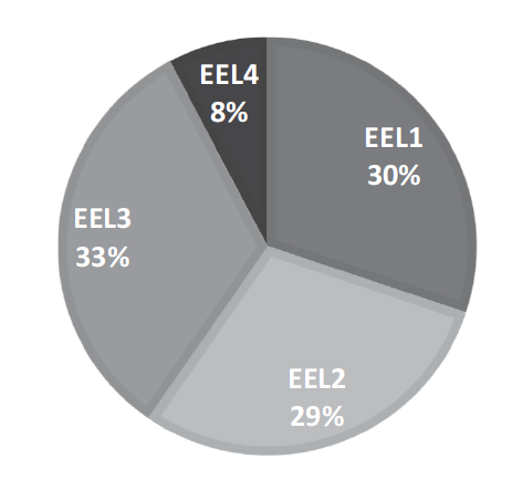 El mayor número de especies tanto de anfibios como reptiles se encontró en la ecorregión I, seguida de la II y III (52, 47 y 46 sp. respectivamente; Figura 4). La EEL IV, que incluye los municipios Pijao y Génova, presentó solamente 12 registros (11,11 %). Para anfibios, el número de especies fue contrastante entre la EEL III (32 sp.) y EEL IV (9 sp.), resaltando esta última por la presencia de especies únicas para el departamento como: Bolitoglossa vallecula, Nymphargus ruizi, N. grandisonae y Parvicaecilia pricei. Las ecorregiones ubicadas al noroccidente del departamento (EEL I y EEL II) presentaron un número de especies intermedio con relación a las demás (25 y 15 sp., respectivamente). Por otro lado, Pristimantis achatinus, Rhinella horribilis, Dendropsophus columbianus y Colostethus fraterdanieli presentaron registros en las cuatro ecorregiones, mientras que Centrolene savagei, Pristimantis erythropleura, P. palmeri, P. thectopternus, B. vallecula y Nymphargus griffithsi estuvieron presentes en el 75 % de las ecorregiones.
