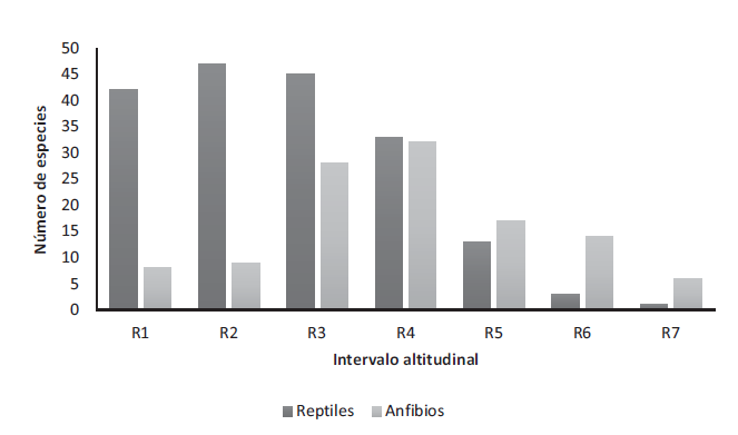 La riqueza de anfibios presentó una distribución gaussiana de acuerdo al gradiente altitudinal, con un pico máximo de riqueza en altitudes intermedias en el rango comprendido entre los 2000-2500 m s.n.m. (R4; 32 sp.) y disminuyendo gradualmente hacia los extremos (Figura 5). Con respecto a R1 disminuye un 75 % y 81 % cuando se compara con R7. El 71 % de las especies de anfibios en el departamento se encontraron distribuidas entre los 1500-2500 m s.n.m. (R3-R4; 34 sp). Los reptiles presentan una tendencia inversa entre la riqueza y altitud, con un valor máximo entre los 1500-2000 m s.n.m. (R2; 47 sp.), es decir un mayor número de registros (68 %) a alturas menores de 1500 m s.n.m. (R1- R2; 40 sp.).