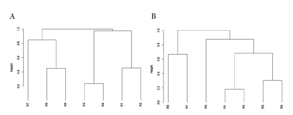Se encontró una similitud del 76 % (Bootstrap = 100 %) entre la composición de los rangos altitudinales R3 y R4, que sugiere la continuidad en el gradiente altitudinal de la fauna anfibia entre los 1500 y 2500 m s.n.m. (Figura 6A). Dos grupos son discriminados en el análisis de agrupamiento compuesto por R3 a R7 y R1 con R2. El grupo que presentó la composición más disímil con respecto a los demás rangos altitudinales fue R7 (Bootstrap = 87 %), este rango comparte solo entre 15 a 30 % de similaridad con R5 y R6. R1 con R2 evidencia la similaridad de las zonas bajas (55 %, Bootstrap = 100), compartiendo un porcentaje de la fauna anfibia que genera una tendencia continua en la identidad del ensamble.