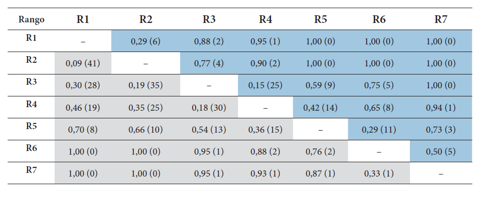 El índice de disimilitud de Whittaker indicó una notable identidad de los rangos extremos en cuanto a sus características composicionales (Whittaker= 1,00, Tabla 2). Los rangos extremos forman por lo tanto estructuras independientes respecto a los rangos altitudinales intermedios. Por último, los rangos R3 y R4 presentan el mayor número de especies y por lo tanto la mayor similaridad entre todos los 1500–2500 m s.n.m. (Whittaker= 0,15). En general, el patrón de agrupamiento entre rangos altitudinales responde a la presencia de especies como Pristimantis alalocophus (2,84 %), Osornophryne percrassa (2,84 %), Dendropsophus columbianus (2,84 %), Pristimantis permixtus (2,83 %) y Rhinella horribilis (2,83 %). Las especies Colostethus ucumari (0,84 %) y Centrolene geckoideum (0,84 %) implican la mayor disimilitud entre rangos y por lo tanto son exclusivas de determinadas alturas.